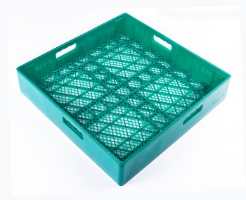 Кассета для столовых приборов изготовлена из пластмассы с пищевым допуском. Внутренние размеры кассеты 466х466 мм. Дно кассеты для столовых приборов, в отличие от нейтральной кассеты, имеет мелкую ячейку, которая не позволяет мелким предметам проваливаться. Эта кассета специально предназначена для мытья столовых приборов (ложек, вилок, ножей). Столовые приборы укладываются прямо в кассету и накрываются сверху одной металлической сеткой (код – 11000101475) во избежание их вылета из кассеты во время мойки.