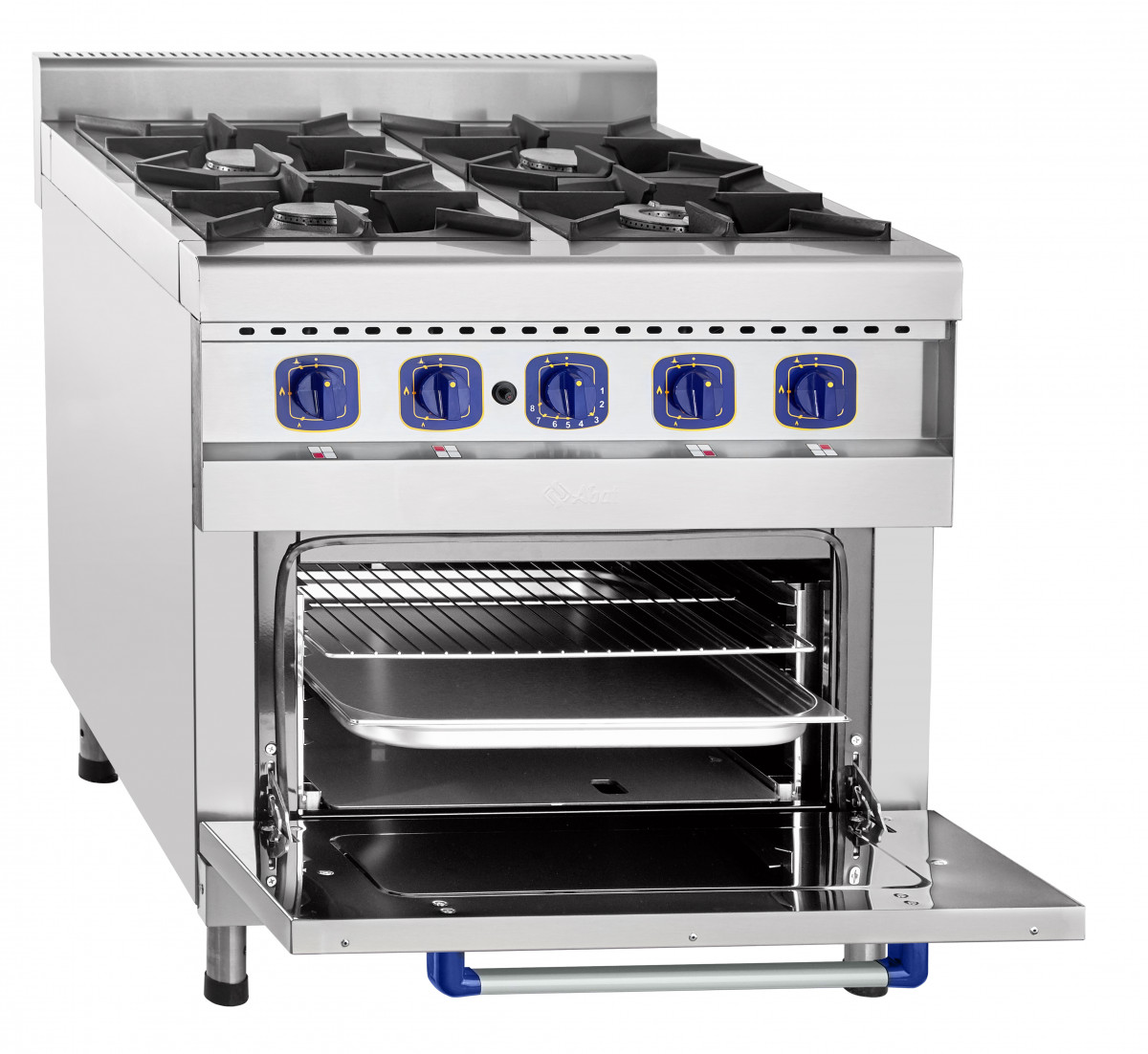 Плита имеет три горелки по 5,5 кВт и одну мощную горелку - 7,5 кВт. Плита снабжена системой поджига и устройством "газ-контроль". Внизу - жарочный шкаф с одним противнем GN 2/1 и одной решеткой того же размера, изготовленные из нержавеющей стали. Рабочий диапазон температуры духовки 120-3200 С. Плита имеет регулируемые по высоте ножки. В комплекте поставляются дополнительные съемные форсунки под "сжиженный газ".