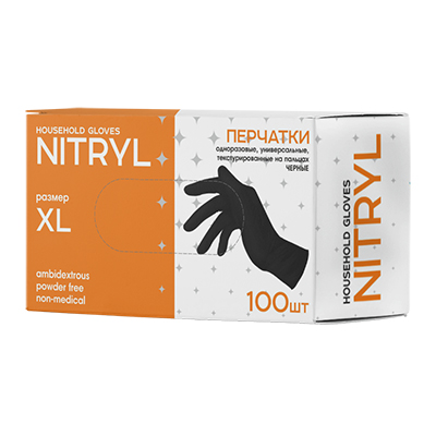 Нитриловые чёрные одноразовые перчатки, 100 шт в коробке. Без латекса и пудры, текстурированные кончики, высокая прочность и химстойкость. Размеры: M, L, XL.