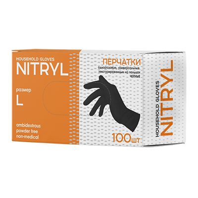 Нитриловые чёрные одноразовые перчатки, 100 шт в коробке. Без латекса и пудры, текстурированные кончики, высокая прочность и химстойкость. Размеры: M, L, XL.