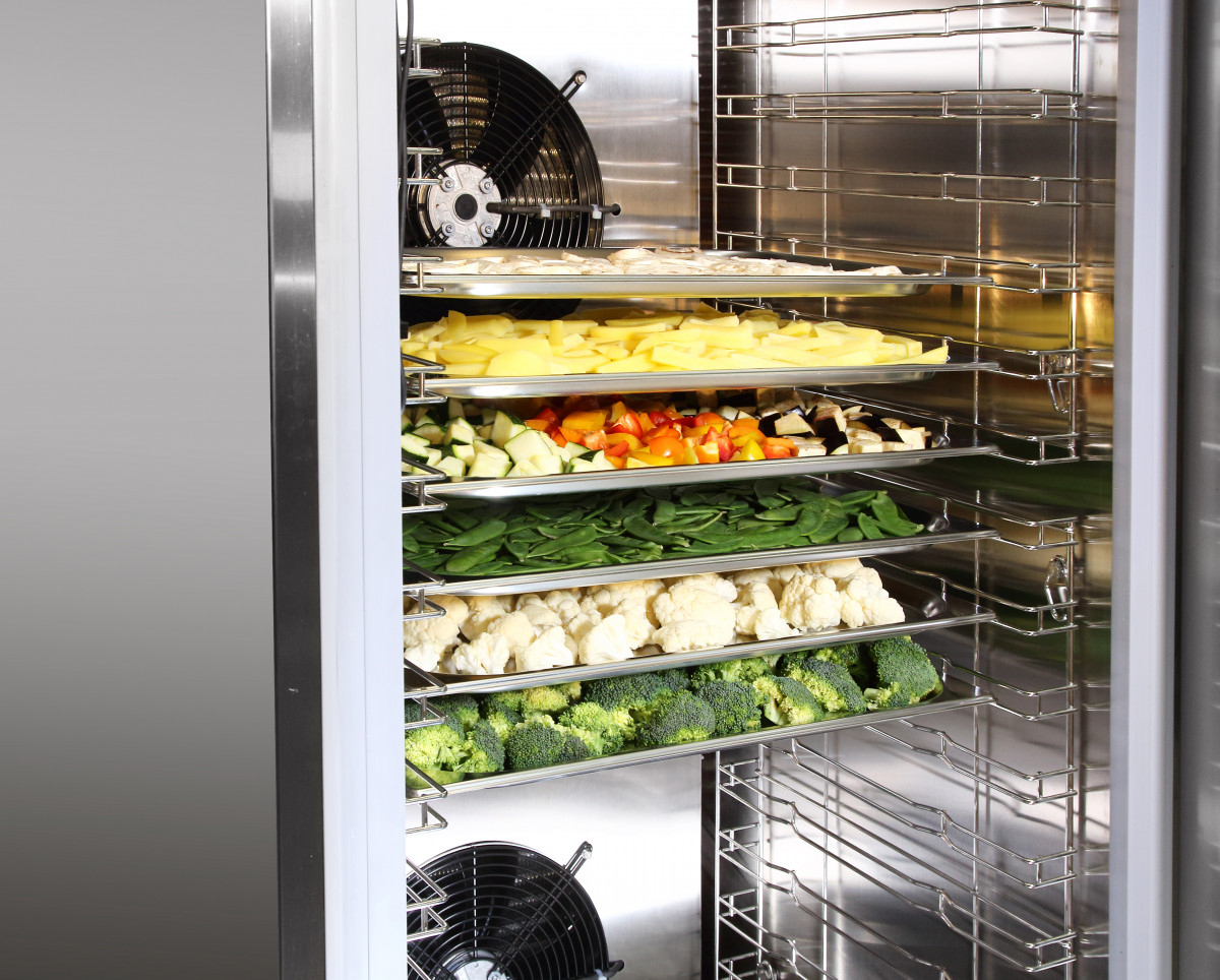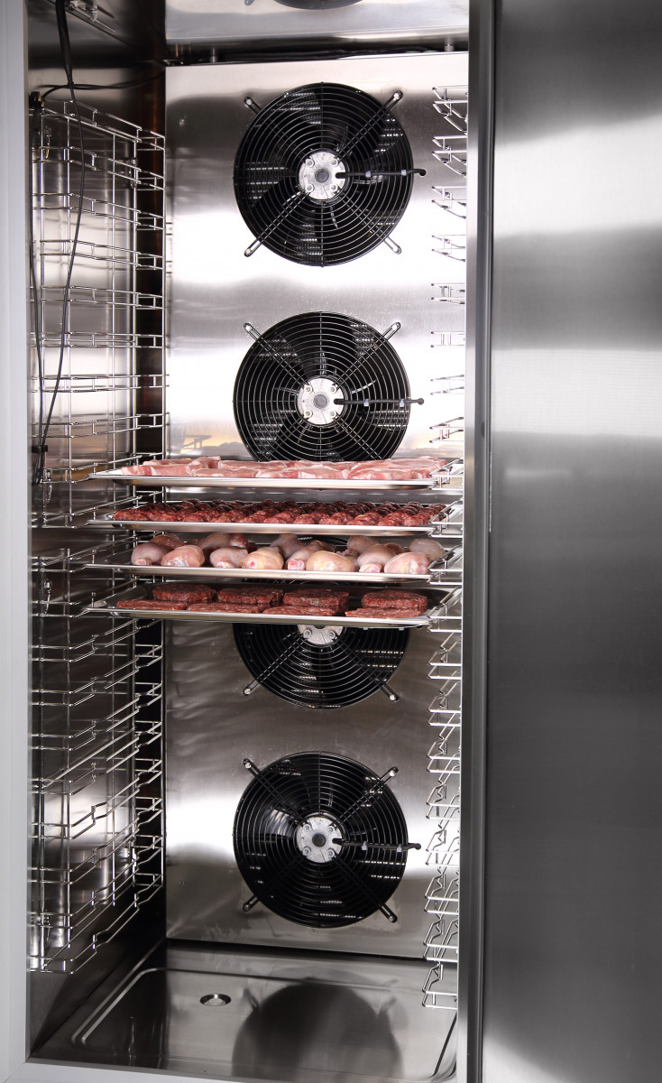 Отличительной особенностью аппаратов интенсивного охлаждения (шоковой заморозки) является использование в них системы эффективной принудительной вентиляции (воздухоохладителя с вентилятором, который обеспечивает равномерное распределение температуры внутри полезного объема камеры). Благодаря такой конструкции продукты, размещенные на полках, быстро охлаждаются в потоке холодного воздуха.