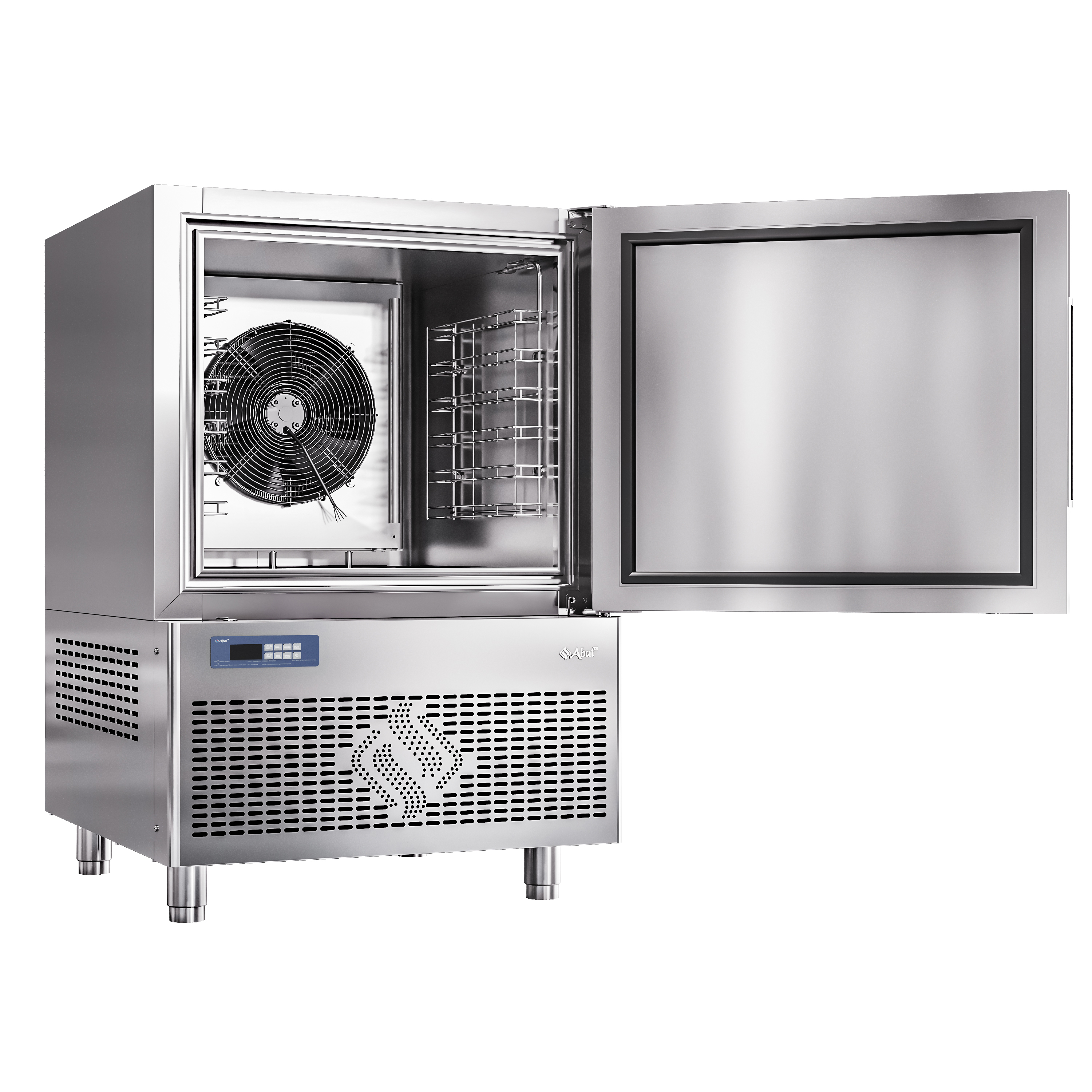 Отличительной особенностью аппаратов интенсивного охлаждения (шоковой заморозки) является использование в них системы эффективной принудительной вентиляции (воздухоохладителя с вентилятором, который обеспечивает равномерное распределение температуры внутри полезного объема камеры). Благодаря такой конструкции продукты, размещенные на полках, быстро охлаждаются в потоке холодного воздуха.