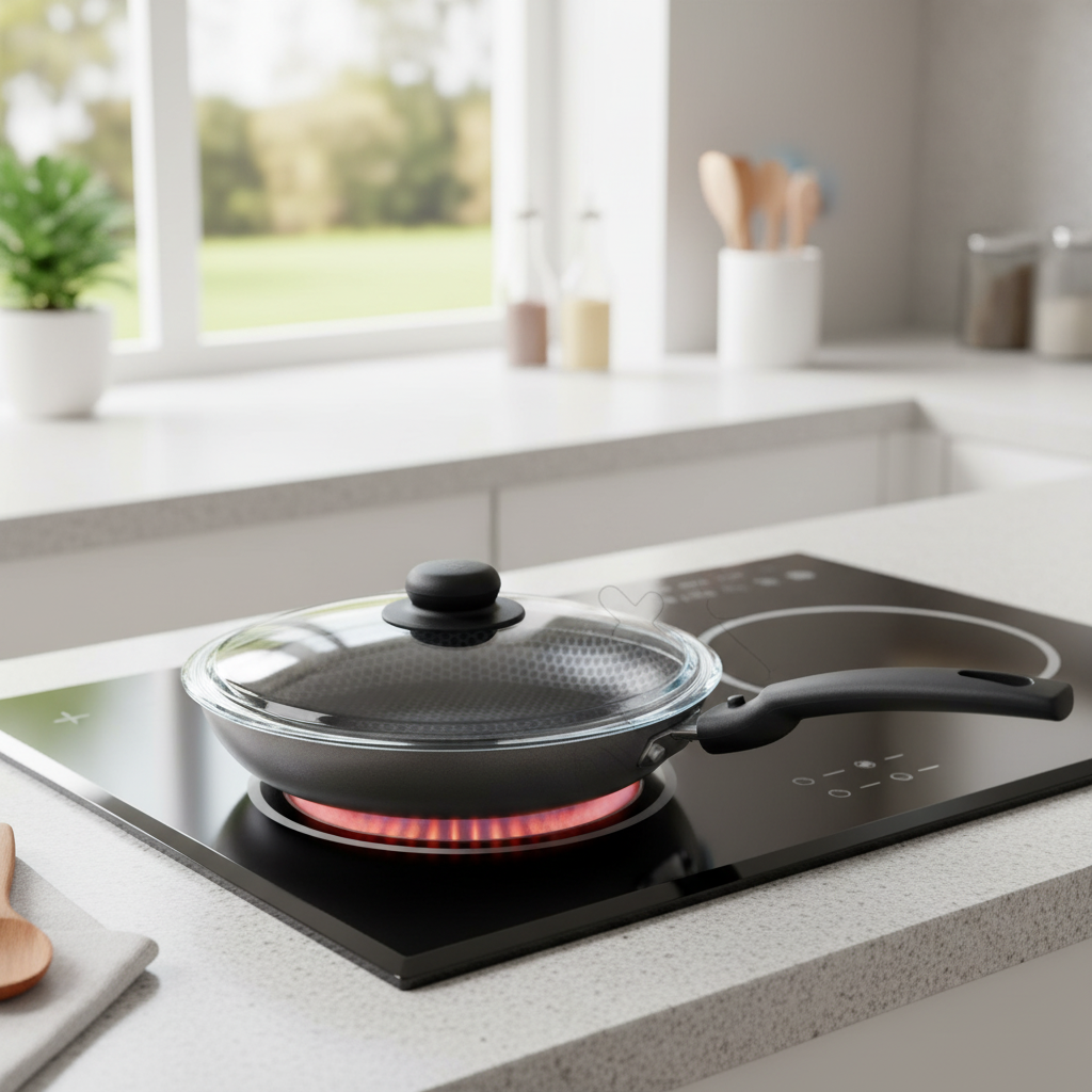 Диаметр 28 см удобен для жарки стейков, овощей и тушения. Оптимальная толщина стенки 2,5 мм равномерно распределяет тепло. Съёмная пластиковая ручка комфортно ложится в руку и экономит место при хранении. Сковорода подходит для газовых, электрических и стеклокерамических плит, безопасна для мытья в посудомоечной машине.