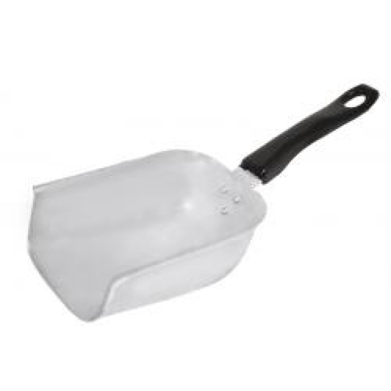 Алюминиевый совок торговой марки Scovo, длина 29 см, ширина 11 см, высота 14,5 см. Толщина стенок и дна 1,6 мм. Ручка выполнена из пластика.